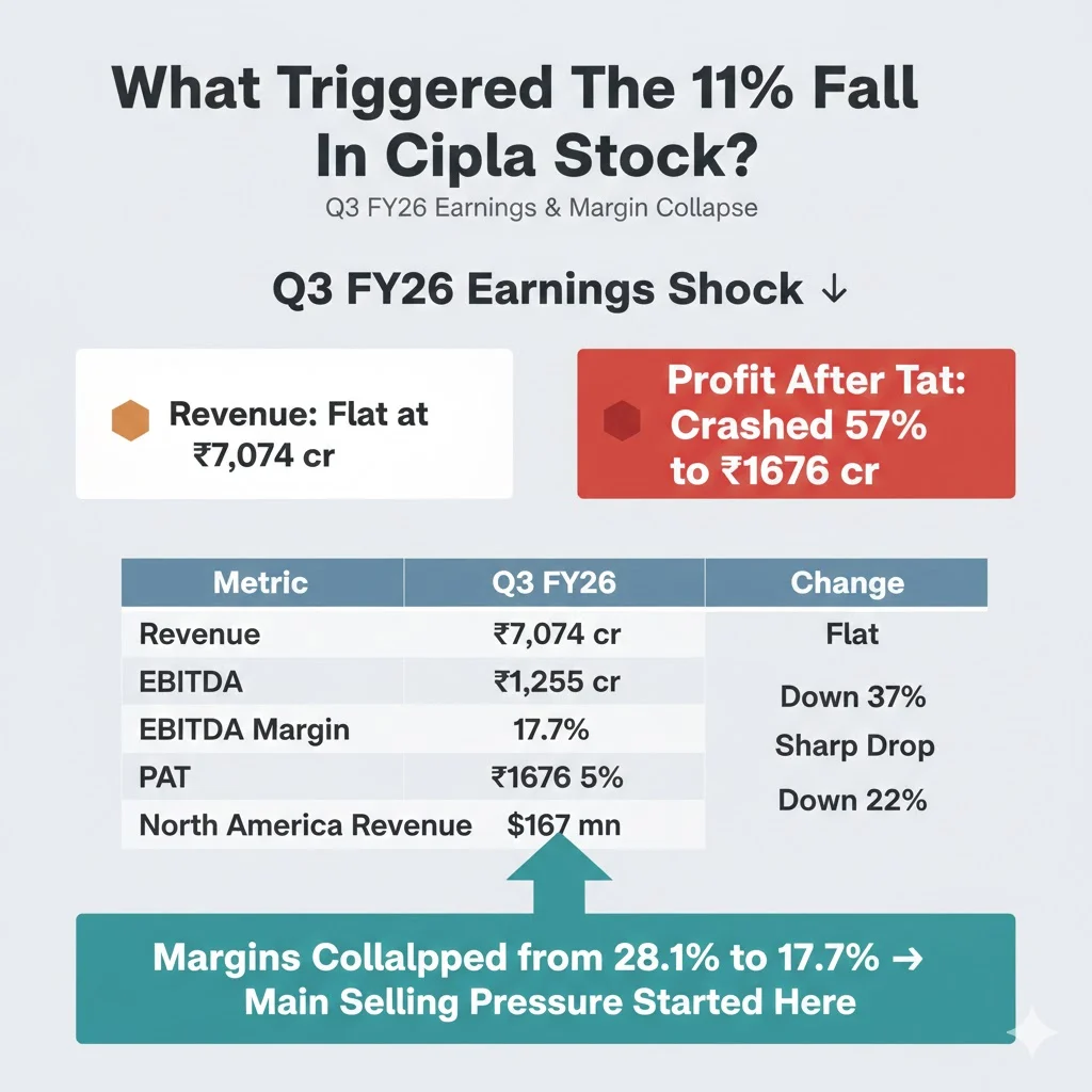 Cipla share price fall of 11% in three months is mainly due to weak Q3 FY26 results, US sales decline, Lanreotide disruption and margin guidance cut. The Street reacted strongly because profit dropped 57%.