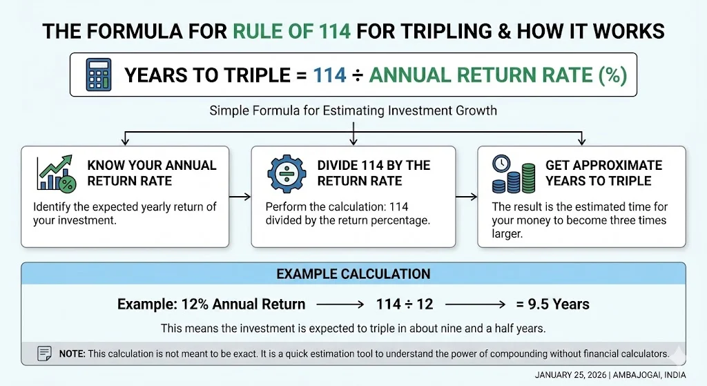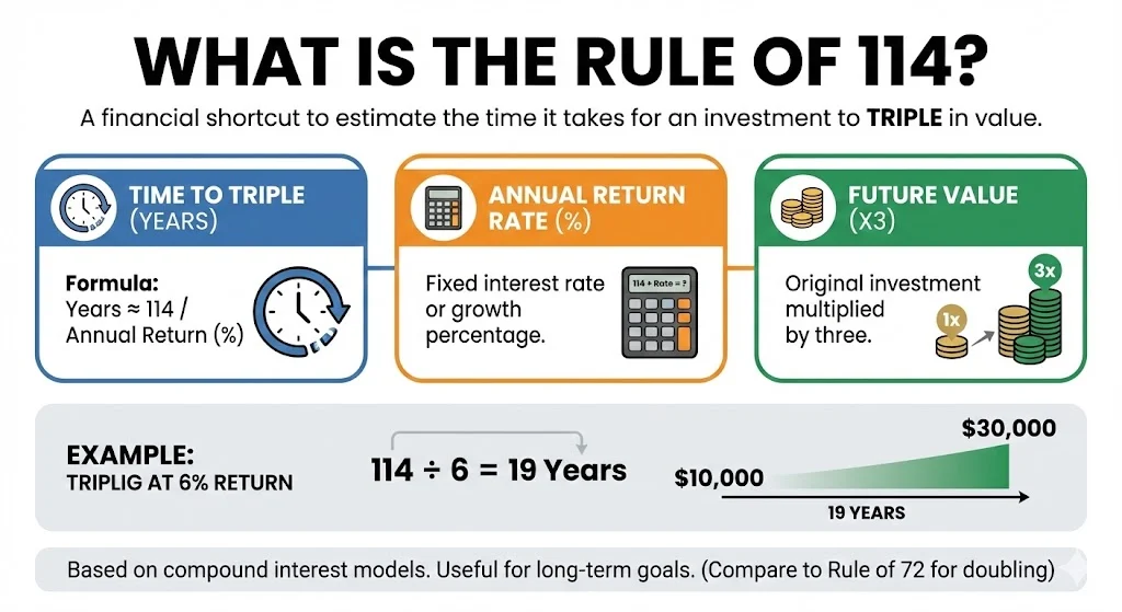 This rule is similar to the well known Rule of 72, which is used to estimate when money will double. The Rule of 114 focuses on tripling instead of doubling. It is useful for long term financial goals where investors want to see how wealth can multiply over decades.