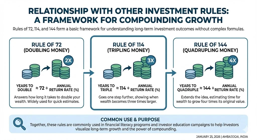 In recent years, the Rule of 114 has gained attention in financial education content across India and global markets. It is often grouped with the Rule of 72 and Rule of 144 as part of essential money rules. Investors use it to plan goals such as retirement, children’s education, and long term wealth creation.